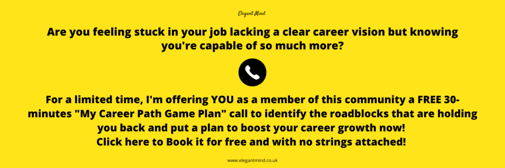 For a limited time only, I’m offering you to book a free 45-minute Career Path Game Plan call with me to help you identify those roadblocks and put a plan together to reach those career goals in record time!